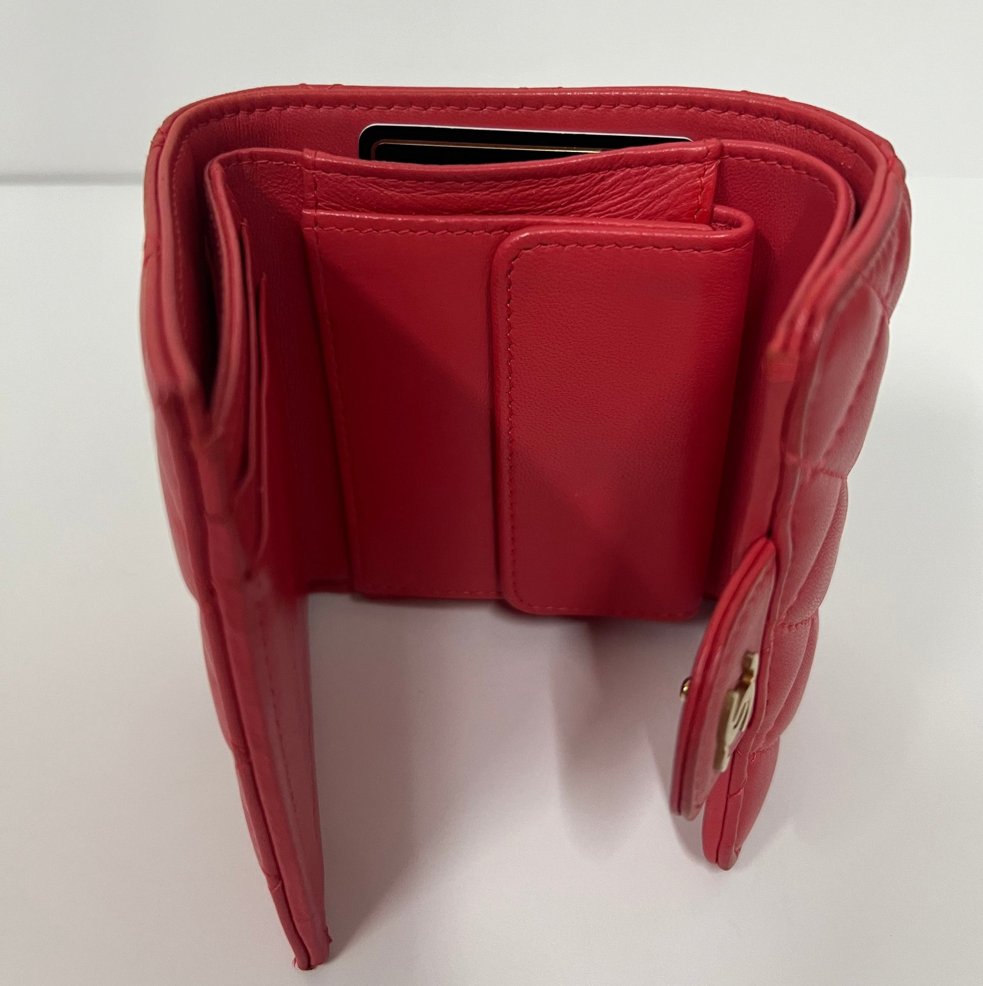 This is an authentic Chanel Caviar Quilted Flap Card Holder Wallet in a vibrant orange-pink hue. Crafted from durable quilted caviar leather, this elegant accessory features a front flap with a polished light gold CC logo. The snap closure opens to a red fabric interior, perfectly sized for cards and small essentials.
