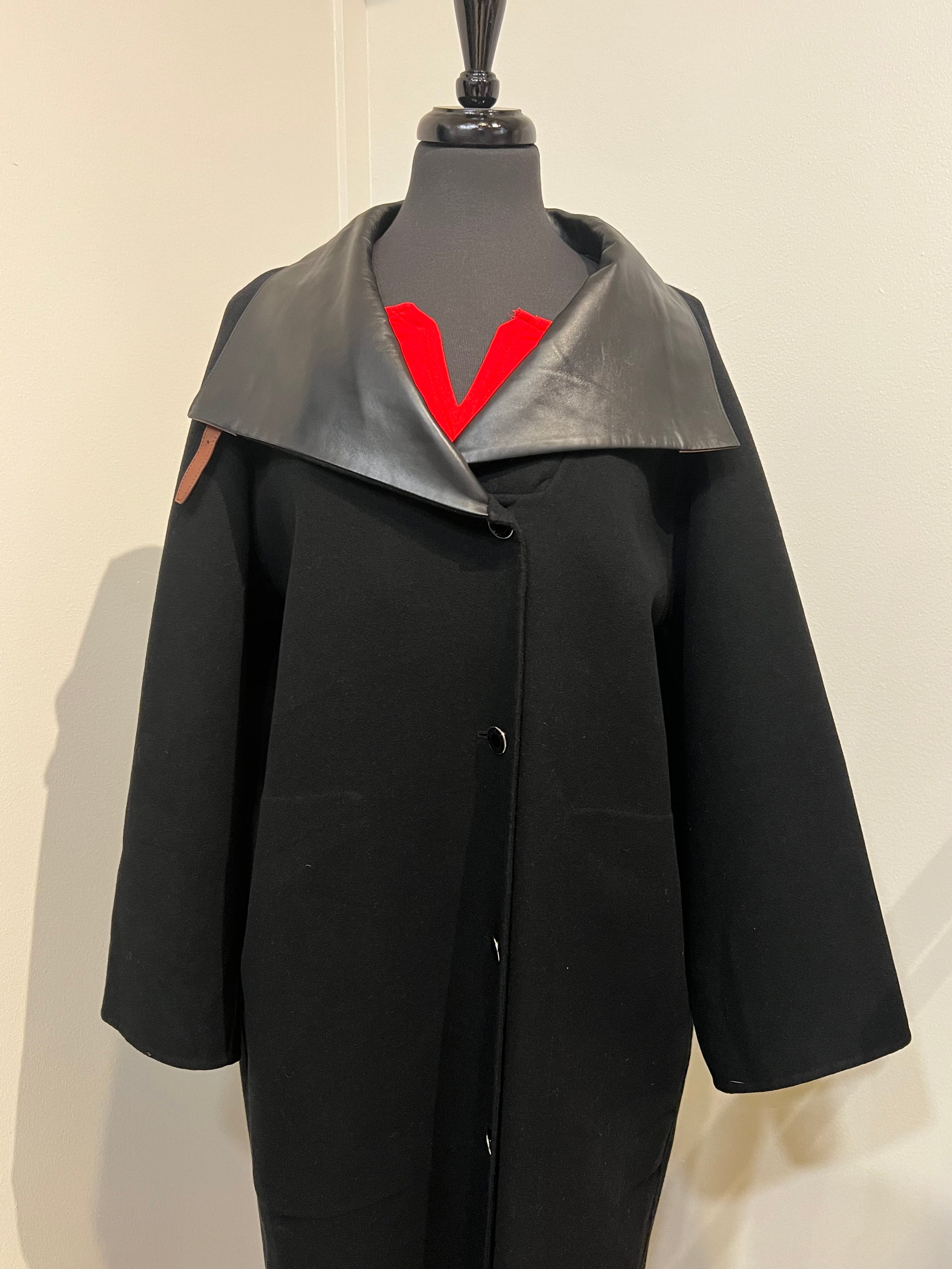 This luxurious Hermès long coat is crafted from soft black cashmere with supple leather panels in front, creating a refined mix of textures. Elegant and timeless, it showcases Hermès’ signature craftsmanship and minimalist sophistication.