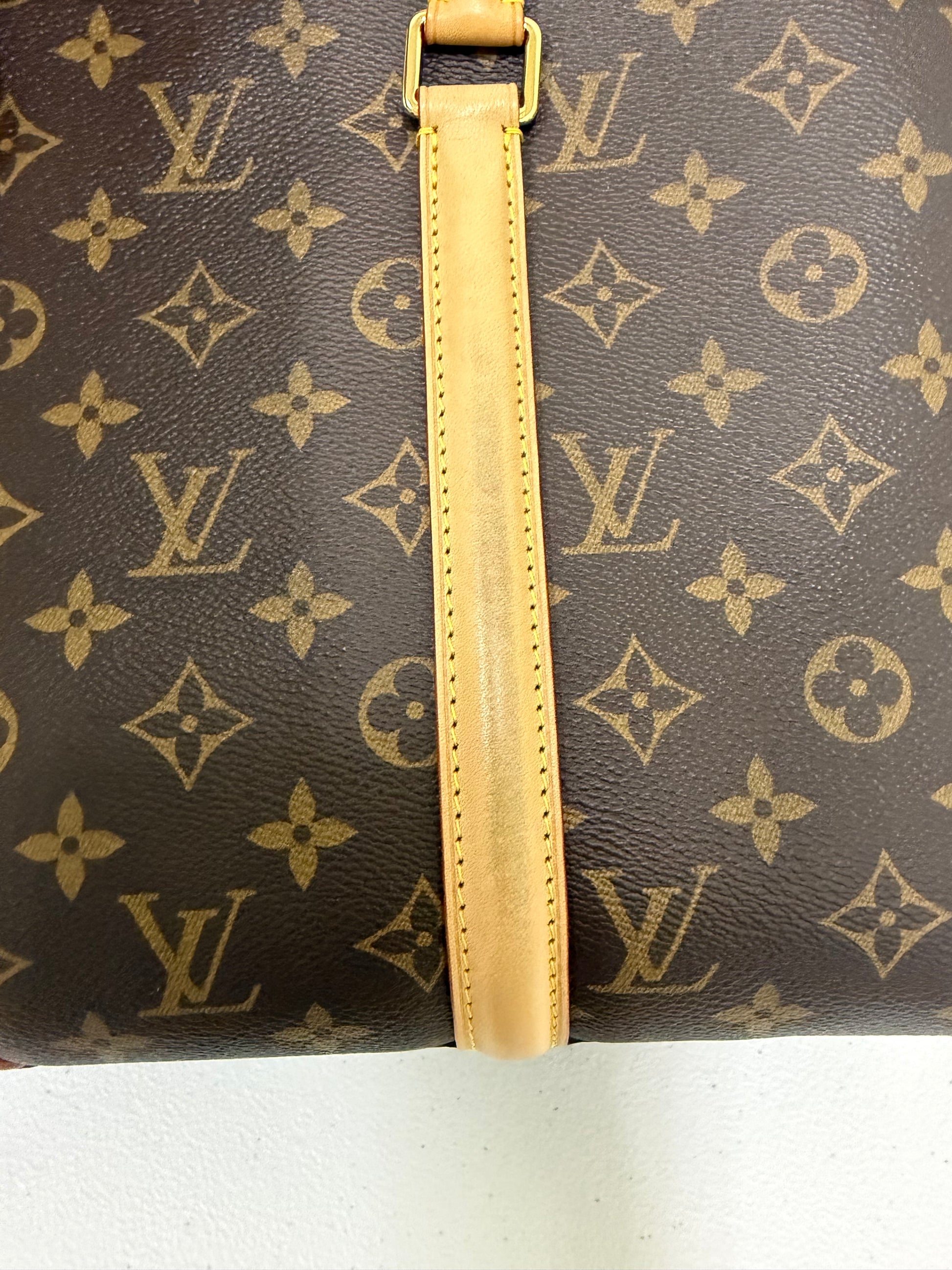 Good overall condition. The interior is in great condition. The leather trim shows visible water marks; however, aside from this wear, the bag remains in excellent overall condition.